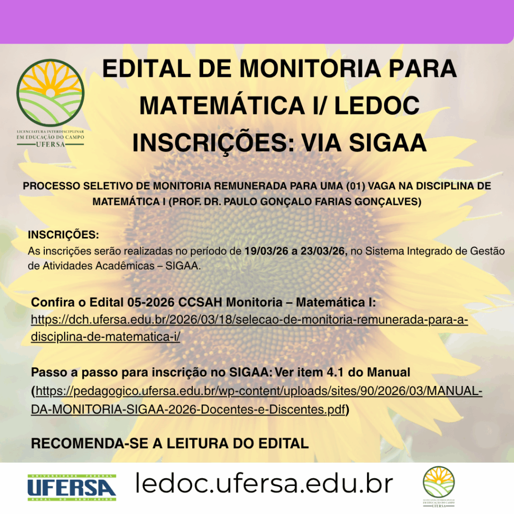 O Curso de Licenciatura Interdisciplinar em Educação do Campo (LEDOC) do Departamento de Ciências Humanas da Universidade Federal Rural do Semi-Árido – Campus Mossoró comunica aos interessados a abertura de inscrições para o Processo Seletivo de monitoria remunerada para uma (01) vaga na disciplina de Matemática I, orientador Prof. Dr. Paulo Gonçalo Farias Gonçalves
