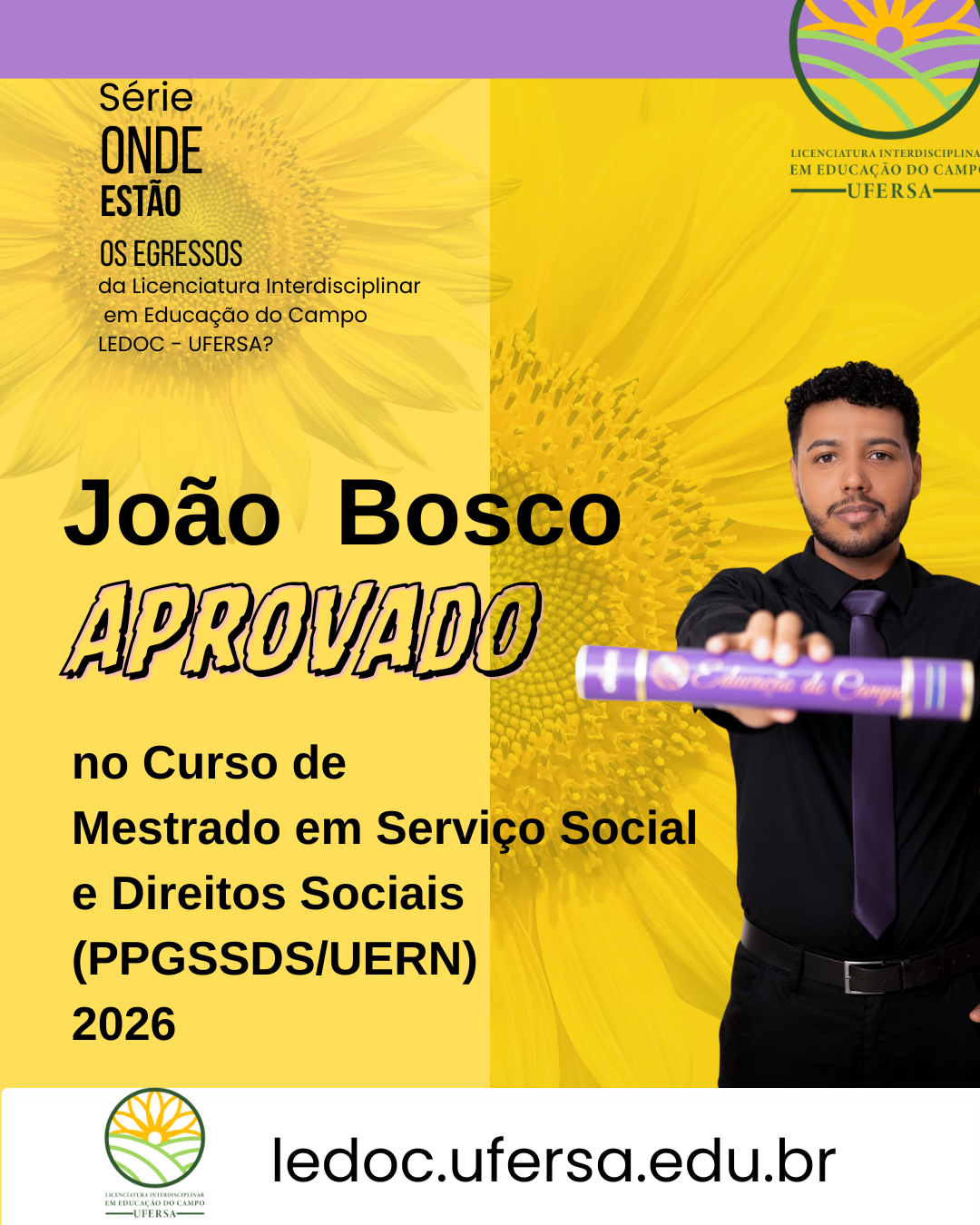 🌻Nosso Egresso João Bosco 🌻Aprovado no Curso de Mestrado em Serviço Social e Direitos Sociais (PPGSSDS/UERN) 2026 “Para mim, ser aprovado no Mestrado em Serviço Social e Direitos Sociais logo após a graduação é a culminância de uma construção que venho realizando desde a minha formação inicial, guiado por um compromisso com a sociedade e com o desejo de me tornar um pesquisador. Ingressar no mestrado representa, em minha trajetória, um passo essencial tanto no meu crescimento pessoal quanto profissional, pois me permite aprofundar as reflexões que já desenvolvia na Educação do Campo. Hoje, no mestrado, venho dialogando com essa experiência, que me conduziu até a universidade, consolidando o vínculo entre minha formação e a luta por direitos sociais. Assim, o mestrado é a continuidade de tudo o que já estudei na Educação do Campo, ampliando meus horizontes e consolidando meu projeto de futuro.”