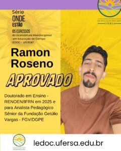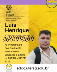 Iniciando a série “Por onde estão os egressos(as) do Curso de Licenciatura Interdisciplinar em Educação do Campo LEDOC UFERSA?” Atenção EGRESSOS, envie notícias suas para a coordenação do curso e uma foto com os dados: nome, aprovações em Pós-Graduação e Concursos, e responder a pergunta: Como foi para você ser aprovado na seleção para pós-graduação, após concluir o curso LEDOC UFERSA e/ou em Concurso Público ou Processo Seletivo, dentre outros que está desenvolvendo como egresso?