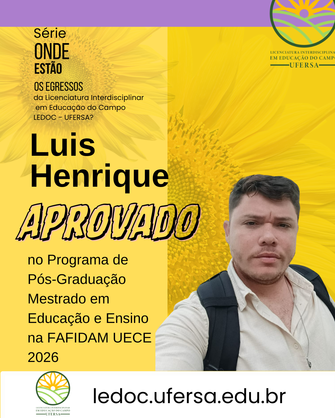 🌻Nosso Egresso Luis Henrique 🌻Aprovado, neste ano de 2026, na seleção de Mestrado pelo Programa em Educação e Ensino (PPGEEN) FAFIDAM na UECE. 🌻Para o egresso “Ingressar na pós graduação, além das aspirações individuais, significa a continuação do desafio de propagação e defesa da Educação do Campo”