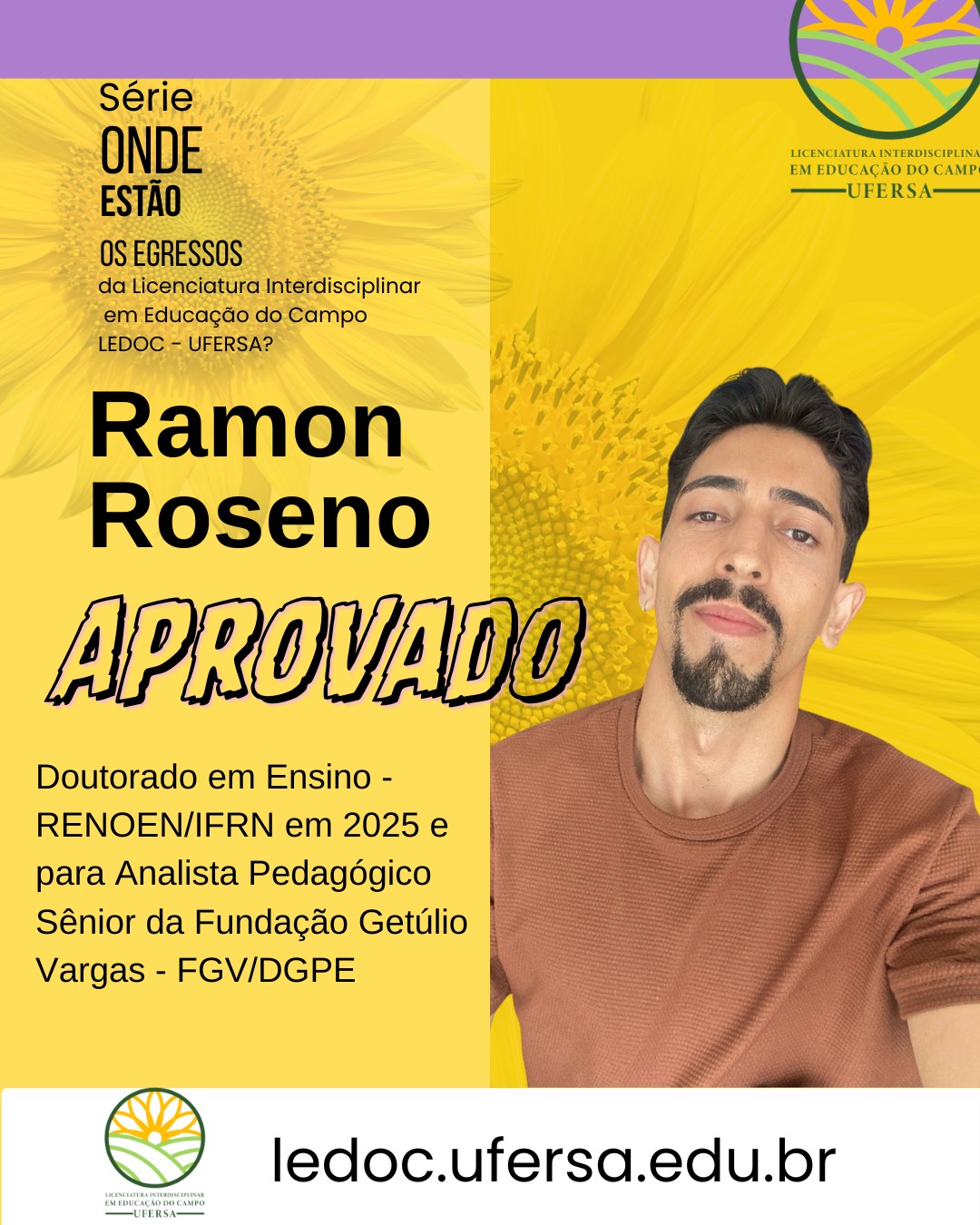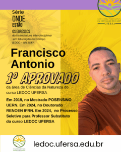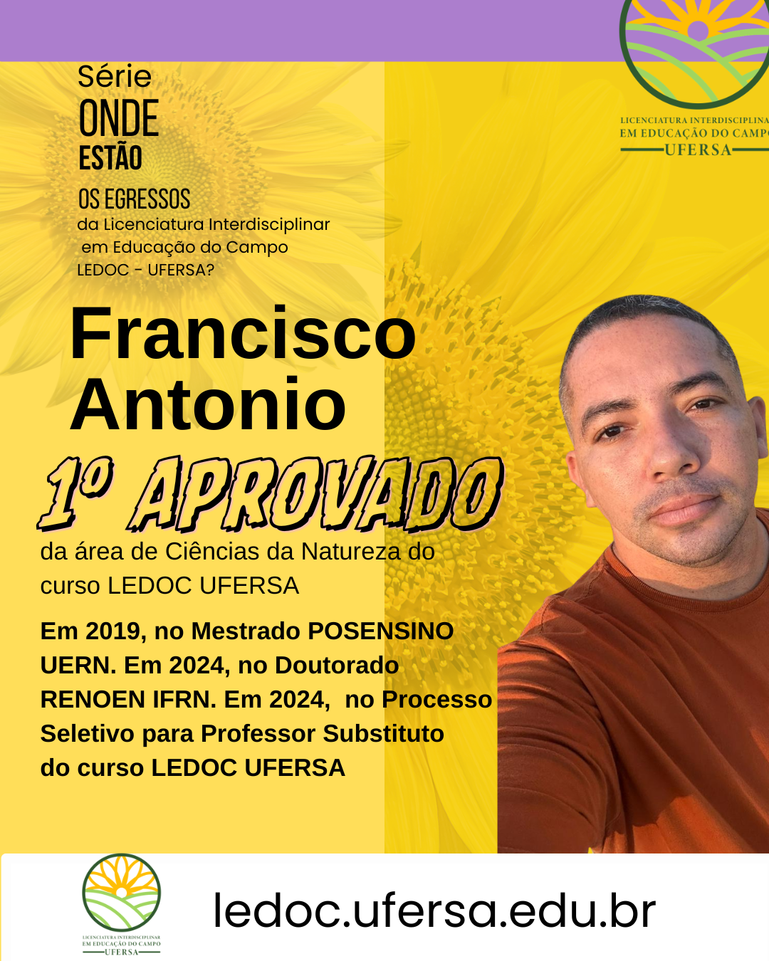 Nosso Egresso Francisco Antônio foi o primeiro da área de Ciências da Natureza a ser aprovado na Pós-Graduação. 🌻Em 2019, no Mestrado POSENSINO UERN. 🌻Em 2024, no Doutorado RENOEN IFRN. 🌻Em 2024, no Processo Seletivo para Professor Substituto do curso LEDOC UFERSA 🌻Mensagem do egresso: “Foi uma conquista que não tem como expressar em palavras e principalmente, foi uma continuação do propósito que é levar a Educação do Campo para todos os espaços e mostra que um egresso da Educação do Campo pode fazer história em todos os campos de conhecimento e mesmo assim, manter sua resistência e identidade com os povos do campo.”