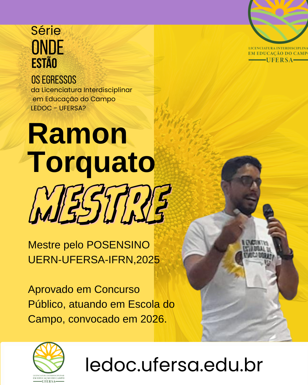 🌻Concluiu em 2019 e ingressou no Mestrado em Ensino POSENSINO – UERN/UFERSA/IFRN em 2023. Em 2026, foi aprovado e nomeado no Concurso Público para atuar na Educação Básica e atua em escola do campo. Para o egresso: “Toda minha trajetória até aqui foi fruto de muitas lutas. Mas nesse processo o curso de licenciatura interdisciplinar em educação do Campo foi primordial para formar em mim uma base consistente para poder conseguir alcançar meus objetivos e avançar em cada nova etapa. A Ledoc é mais do que uma graduação, é uma formação para a vida, sou grato a todas e todos que fizeram parte desse processo, e vamos a luta pois a educação do campo é construida assim em movimento!”