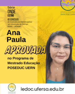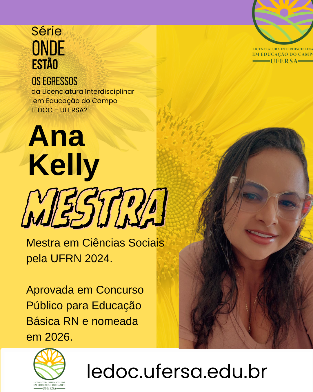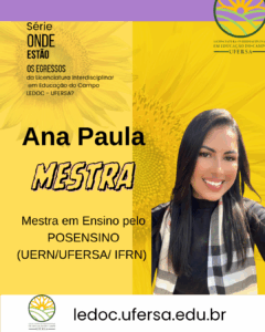 🌻Nossa Egressa Ana paula. 🌻Concluiu em 2022 e ingressou no Mestrado em 2023. 🌻Mestra em ensino pelo POSENSINO – UERN/UFERSA/ IFRN e trabalha em uma escola no município de Felipe Guerra/RN. 🌻Para a Egressa: Foi uma grande conquista ingressar no curso de mestrado assim que concluí a graduação. Finalizei a Licenciatura em Educação do Campo em 2022 e, já em 2023, iniciei o mestrado, tendo sido aprovada logo na primeira tentativa. Essa experiência foi muito significativa para mim, pois tive a oportunidade de dar continuidade à pesquisa que havia iniciado ainda na graduação. No mestrado, pude ampliar e aprofundar esse estudo por meio da minha dissertação, o que contribuiu bastante para minha formação acadêmica. O mestrado foi um processo transformador, que me proporcionou novos conhecimentos, novas perspectivas e um maior amadurecimento pessoal e profissional.”